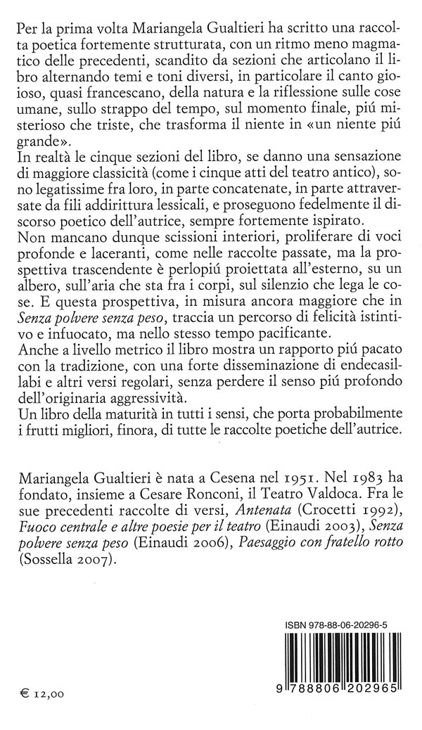 Gualtieri, Mariangela Senza polvere senza peso Giulio Einaudi Editore, Torino 2006 € 11,50 copertina / quarta di copertina |